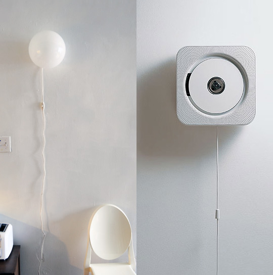 El emblemático Reproductor de CD de pared de Muji ha sido rediseñado para incluir radio FM, control remoto y pantalla LCD retroiluminada. Los altavoces están incorporados en el cuerpo del reproductor de CD y para encenderlo simplemente se tiene que tirar suavemente del cable.